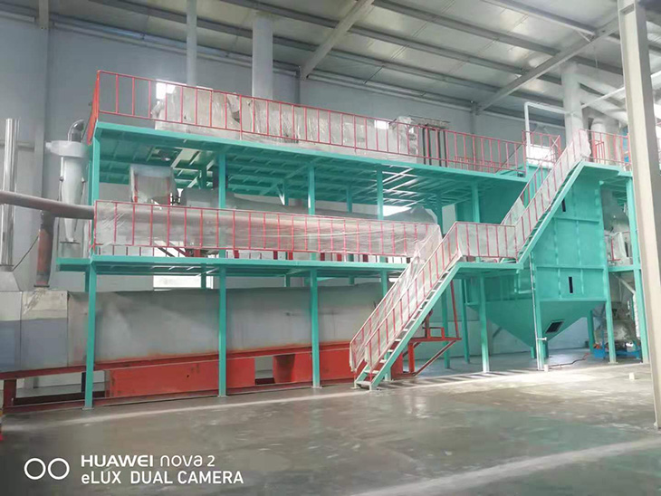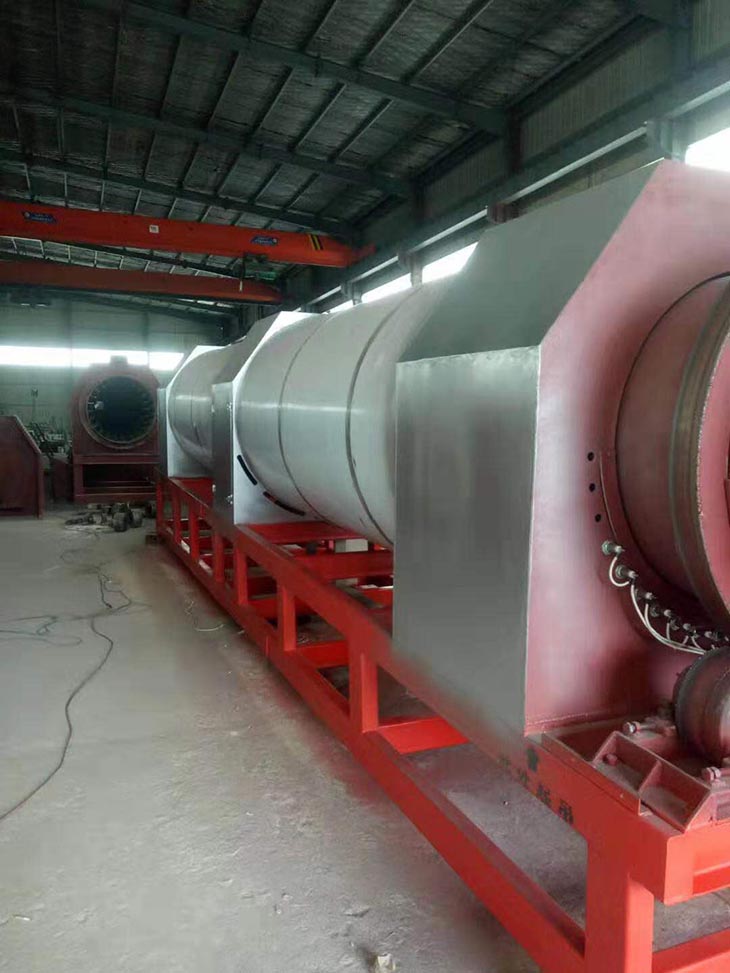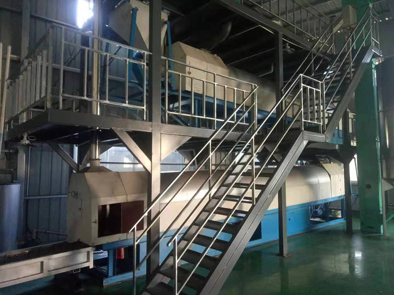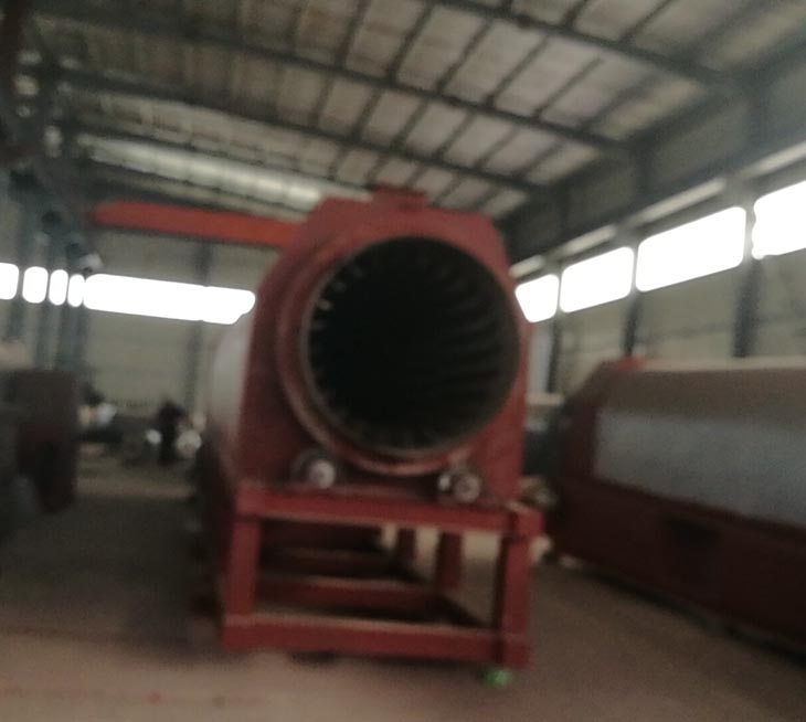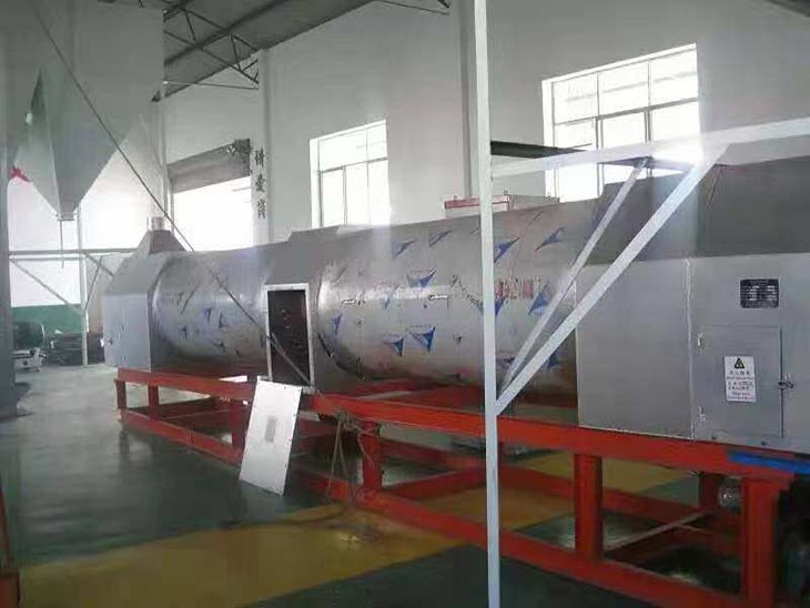 我們解決其技術問題所采用的技術方案是:一種新型環(huán)保節(jié)能熱風炒爐,由電源供電,包括第一燃燒室、第二燃燒室、熱風炒爐滾筒、存料機、自動喂料器、出料機、引風機和排潮風機,所述熱風炒爐滾筒的入口端通過自動喂料器與所述存料斗連通,所述熱風炒爐滾筒的入口端還通過風道與所述排潮風機連通,所述熱風炒爐滾筒的出口端與出料機連通,所述第一燃燒室和第二燃燒室通過風道與引風機連通,所述第一燃燒室和第二燃燒室分別位于所述熱風炒爐滾筒的下方,所述熱風炒爐滾筒軸心線與水平面形成2°到8°的夾角,所述第一燃燒器和第二燃燒器安裝位置在相應燃燒室的前端或者相應燃燒室的兩個側面。我們設備取消了原熱風炒爐所配套的單獨熱風爐、彎段風道或直段風道;在炒爐滾筒下方設計安裝兩份熱風燃燒室,用燃燒器產生的熱風直接對滾筒進行加熱,******限度地縮減了炒爐散熱環(huán)節(jié)和面積,從而實現炒爐連段式加熱。與現有設備相比,我們公司設備充分利用了熱風釋放的熱量,減少了熱量損失,單噸油料或糧食加工消耗添人氣甚至能降低到25nm3,降低了17%,節(jié)能降耗效果非常明顯,得到了客戶的一致好評。與現有設備相比,同等日加工量,所配兩臺燃燒器合計功率比現有設備燃燒器功率下降20%-30%,熱風設定溫度有750-800℃下降到400-500℃,明顯延長了炒爐的使用壽命。第一燃燒室和第二燃燒室的功能各不相同,工作溫度也不一致,第一燃燒室和第二燃燒室能夠實現分段加熱溫度控制,更加靈活與合理,安全可靠,便于操作與控制。
